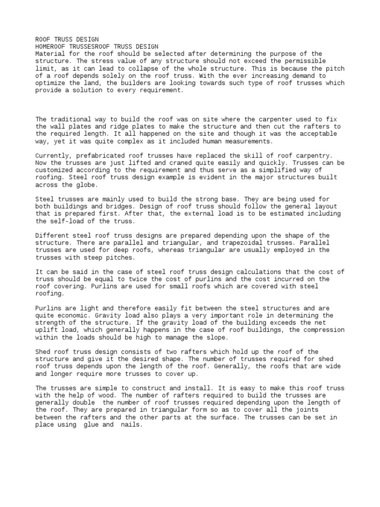Example roof truss analysis 4 6 live load roof live load lr 20 psf r1 06 r1 10 r1 12 0001 at at 25 ft x 10 ftpanel x 8 panels 2000 sf r1 12 0001 x 2000 sf 060 lr 20 psf x 06 12 psf plr int 12 psf x 25 ft x10 ft 300 k due roof live load plr. They are being used for both buildings and bridges. If youre looking for a complete guide for roof trusses then youve come to the right place. Single span truss and post frame for a low pitch roof using battened section chords sx017a en eu.